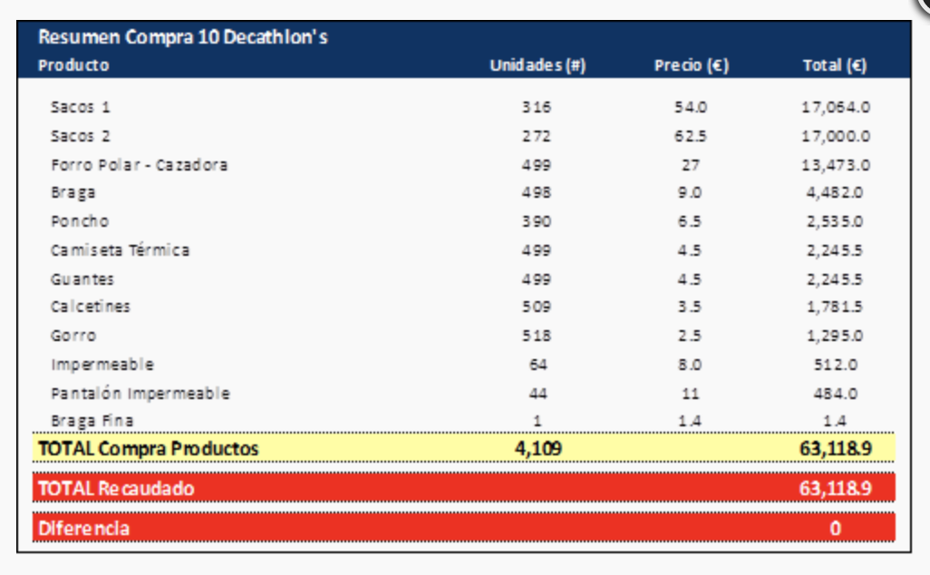 A continuación os detallo lo que pudimos comprar y repartir gracias a TU COLABORACIÓN EN EL VOLUNTARIADO EXPRESS (si queréis mayor detalle, lo tenéis en la pestaña “Facturas & Cuentas 14/15”, donde veréis la compra detallada de cada Decathlon, facturas escaneadas y un detalle de mi cuenta con todas las aportaciones que entraron – veréis que los nombres están tachados para darle confidencialidad a las aportaciones).