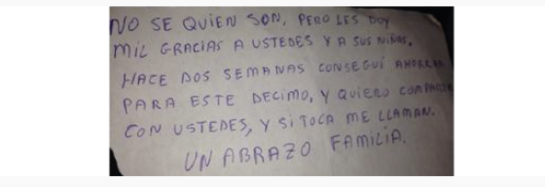 Para contrarrestar este punto y mostrar que la gratitud puede ser INFINITA, os dejo la nota que una PSH dejó el Sábado por la mañana en el portal de la casa de una familia (fueron con los niños también) que les habían dejado un kit.