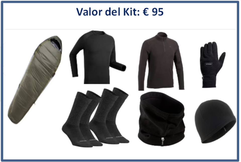 PD1. Cada kit de abrigo vale € 95. El objetivo es dar un kit lo más completo posible para quien lo reciba se pueda abrigar sin problema y de esa forma solucionarle el problema del frío o al menos ayudarle a pasar mejor el invierno